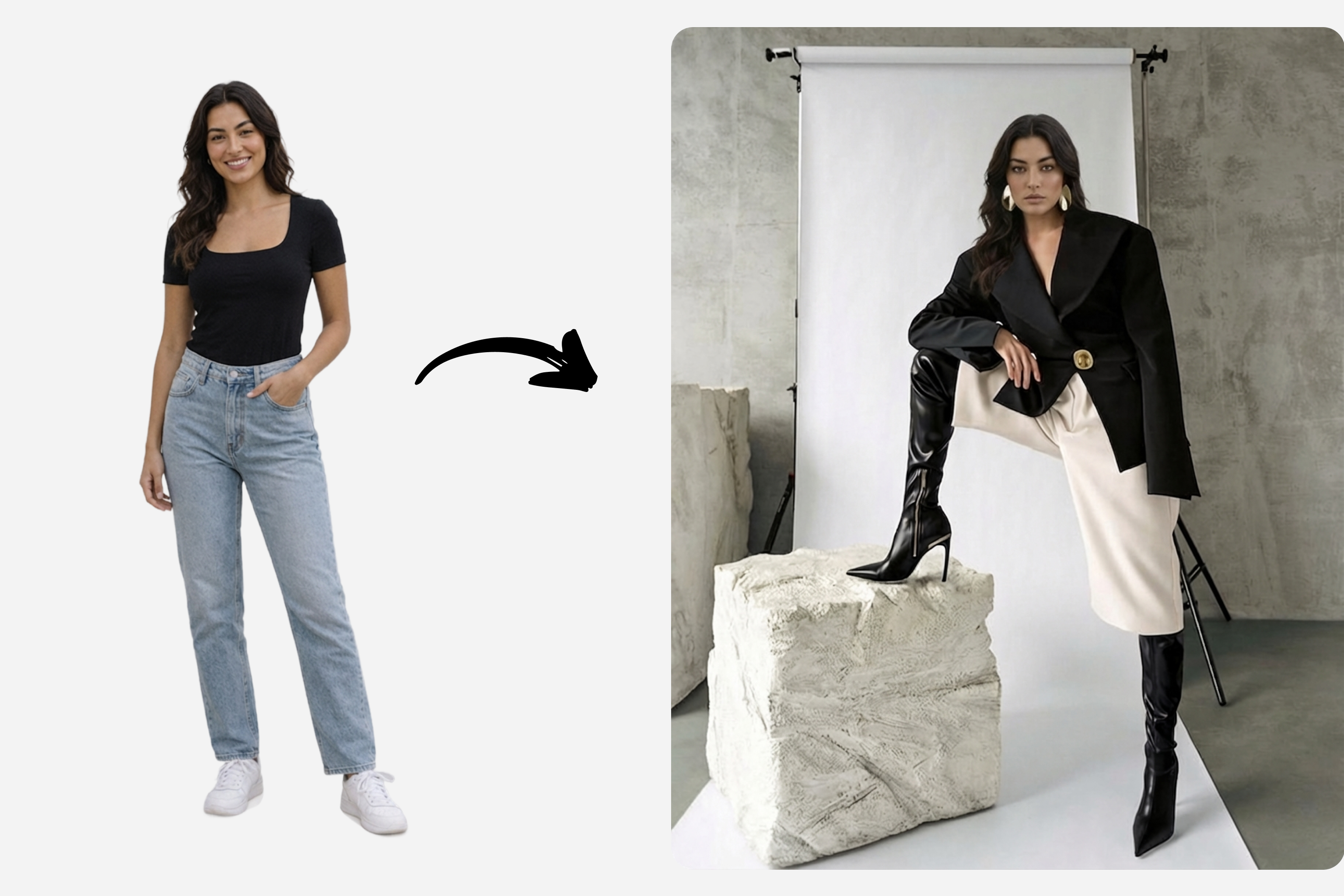 Try White studioTurn on-model photos into clean catalog shots. Perfect for e‑commerce and lookbooks.